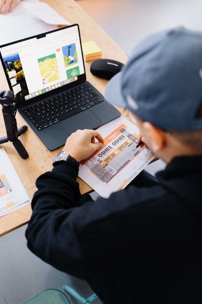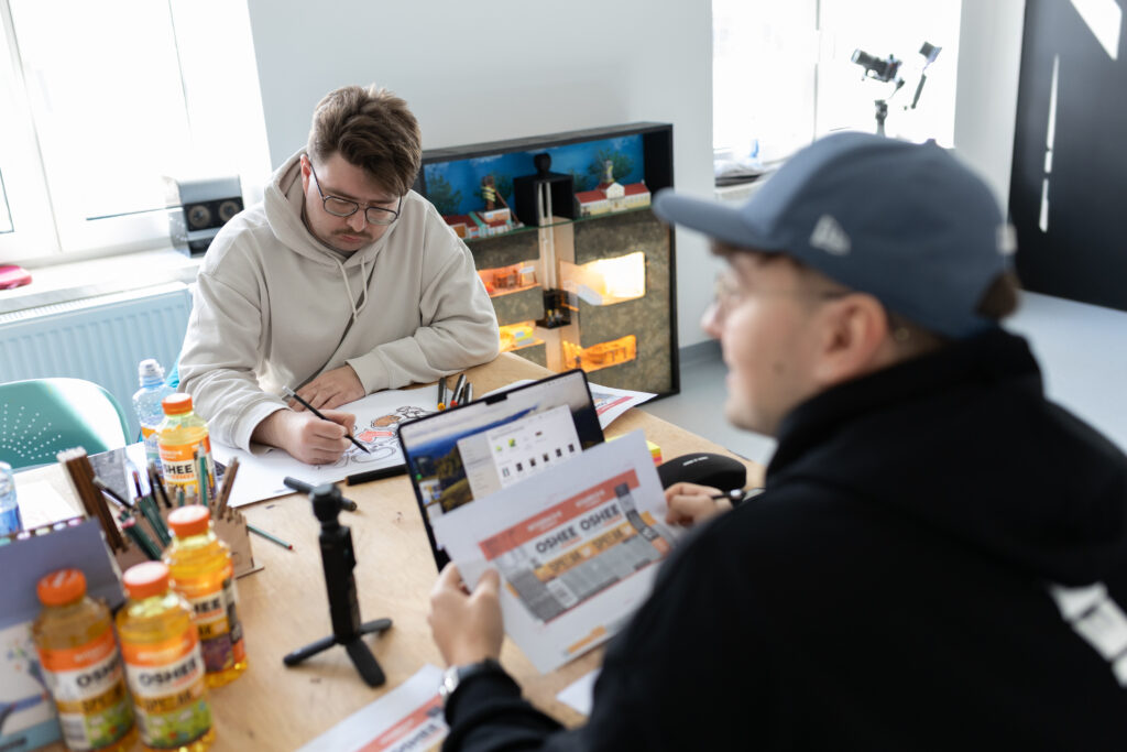 Warsztaty były kolejnym etapem konkursu OSHEE SPEAK UP „Daj głos emocjom”. W spotkaniu uczestniczyli finaliści: @prostowsiatke, @lia_wlosinska_ oraz @tired_bboi, którzy pracowali nad autorskimi koncepcjami nowych etykiet, przenosząc emocje na formę wizualną.